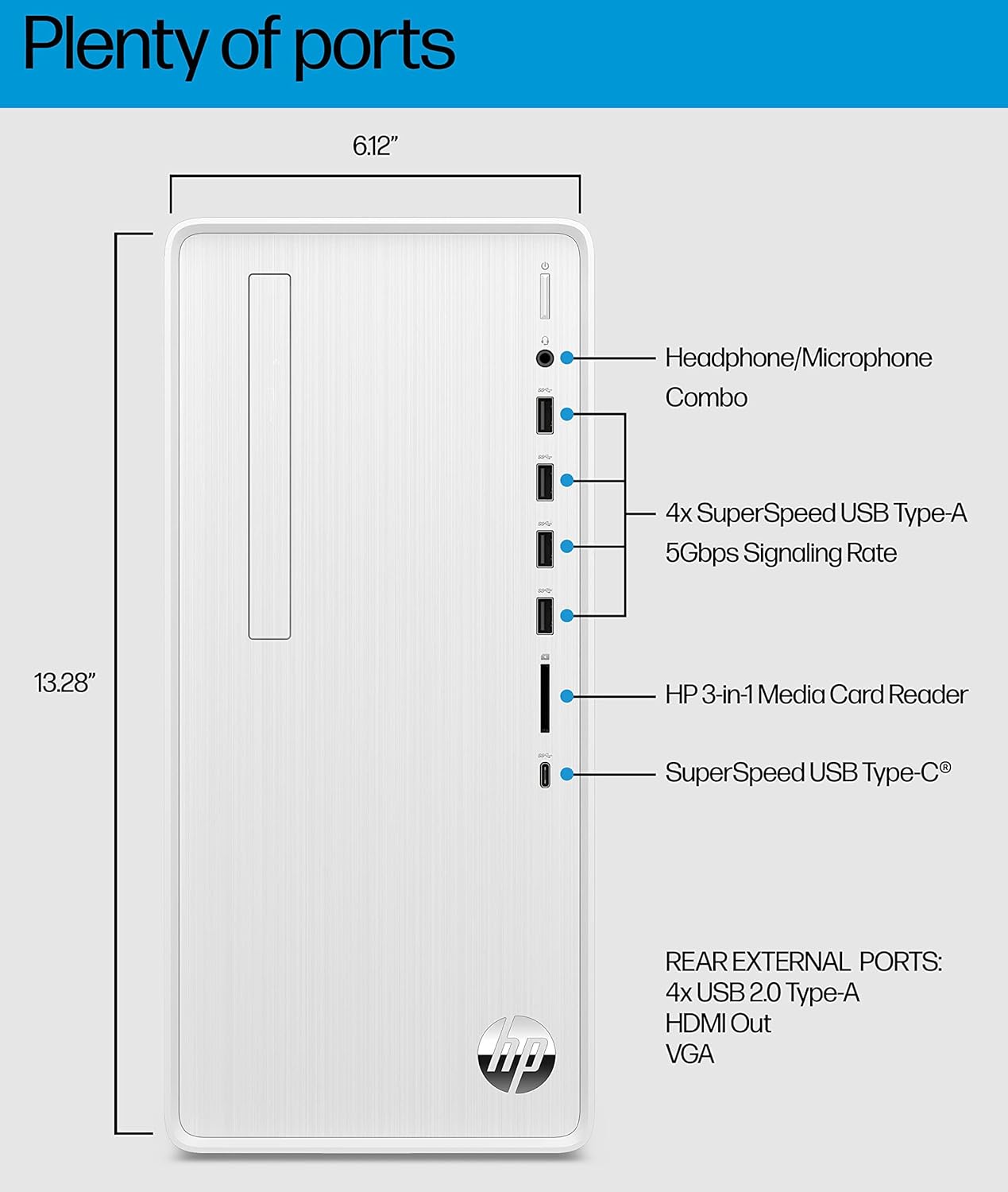 - Ports: Front – 1 headphone/microphone combo, 4 SuperSpeed USB Type-A 3.2 Gen1, HP 3-in-1 memory card reader, 1 SuperSpeed USB Type-C 5Gbps signaling rate; Rear – 1 audio-in, 1 audio-out, 1 microphone, 1 HDMI, 1 VGA, 4 USB 2.0 Type-A, 1 RJ-45