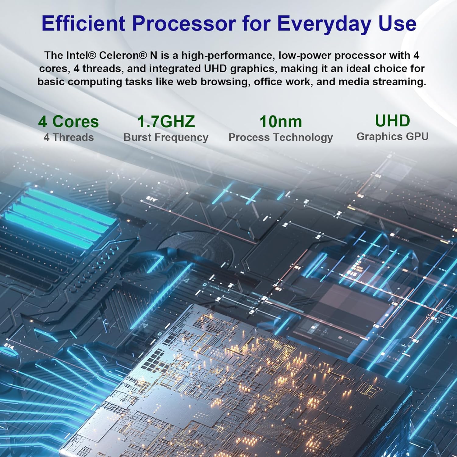 - Intel Celeron N processor with basic frequency up to 1.7GHz