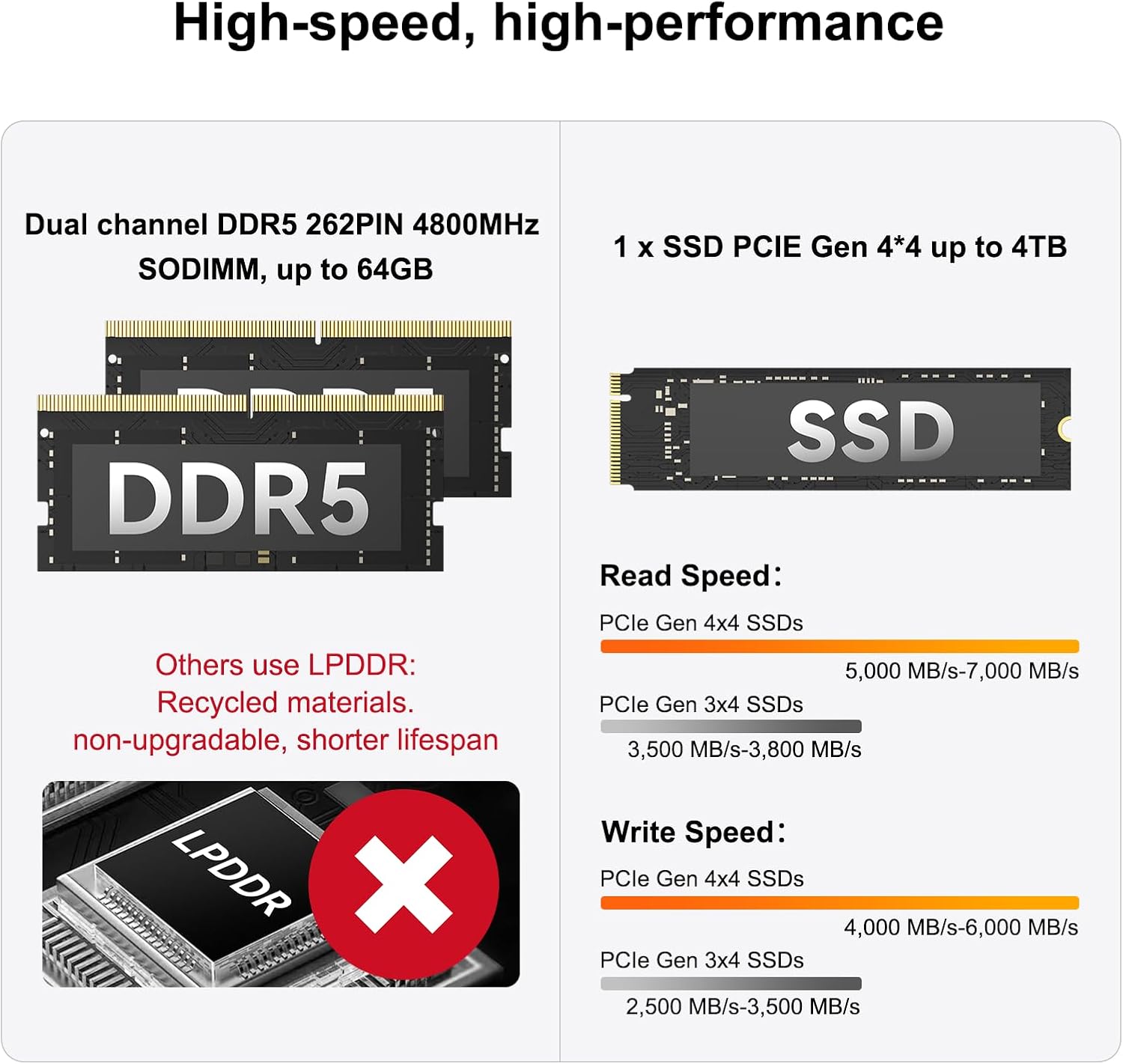 One of the standout features of the GEEKOM A6 Mini PC is its upgradability. The device comes with 32GB of DDR5 RAM, which can be upgraded further to meet the user’s needs. Additionally, the 1TB PCIe 4.0 NVMe SSD provides ample storage for files, programs, and data. Users can also expand their storage capacity by adding an M.2 2242 SSD (up to 2TB), making it easy to store thousands of photos, songs, or hours of HD video.