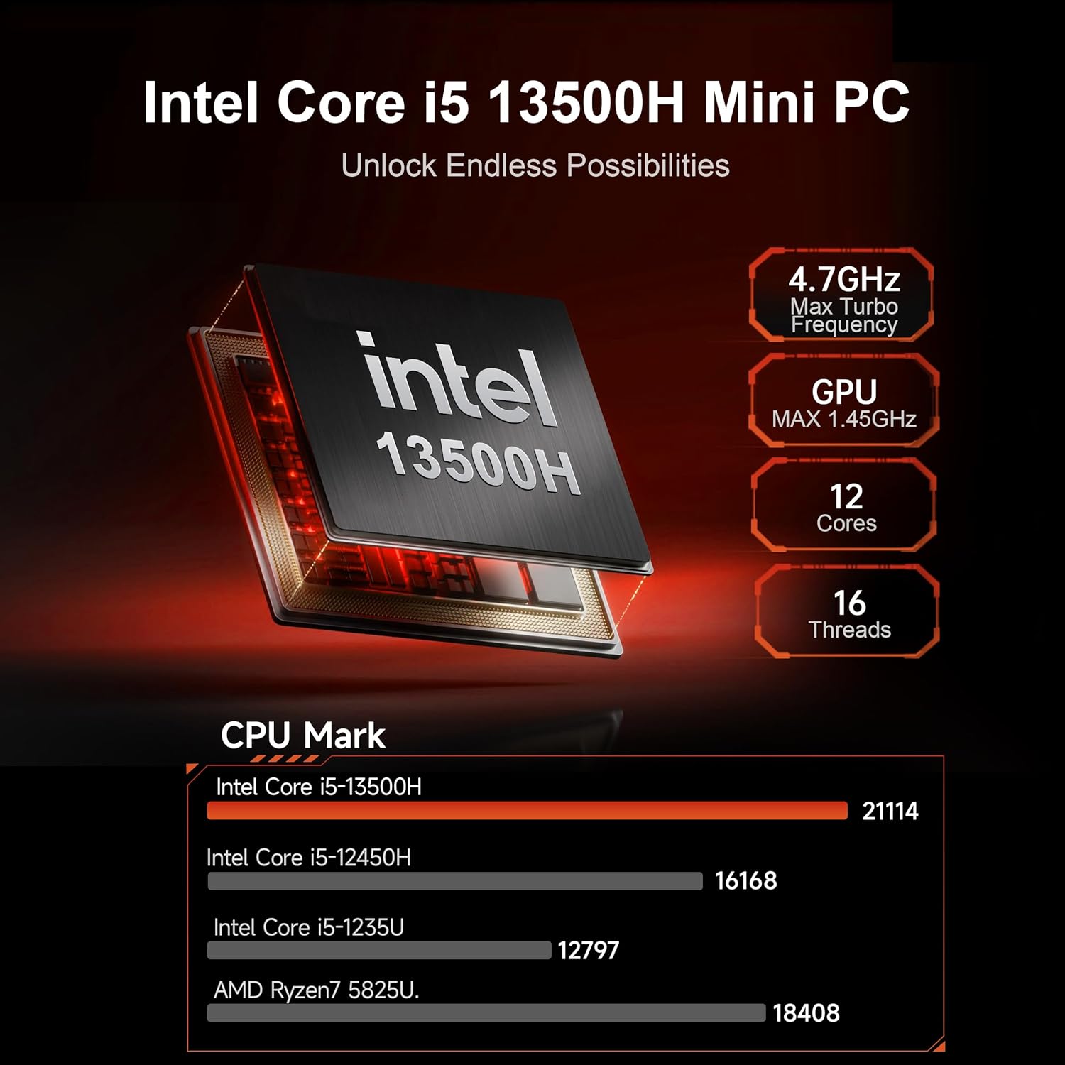 The Beelink EQi13 Pro Mini PC is powered by an Intel Core i5 13500H processor, which boasts 4 performance cores and 8 efficiency cores, as well as 16 threads. This powerful processor has a maximum turbo frequency of 4.7GHz, delivering extremely fast processing speeds. The processor also features an 18MB smart cache, which allows for quick access to data, resulting in a 20% performance improvement over the 12450H. This makes the mini PC suitable for multitasking office work, gaming, programming, and development.