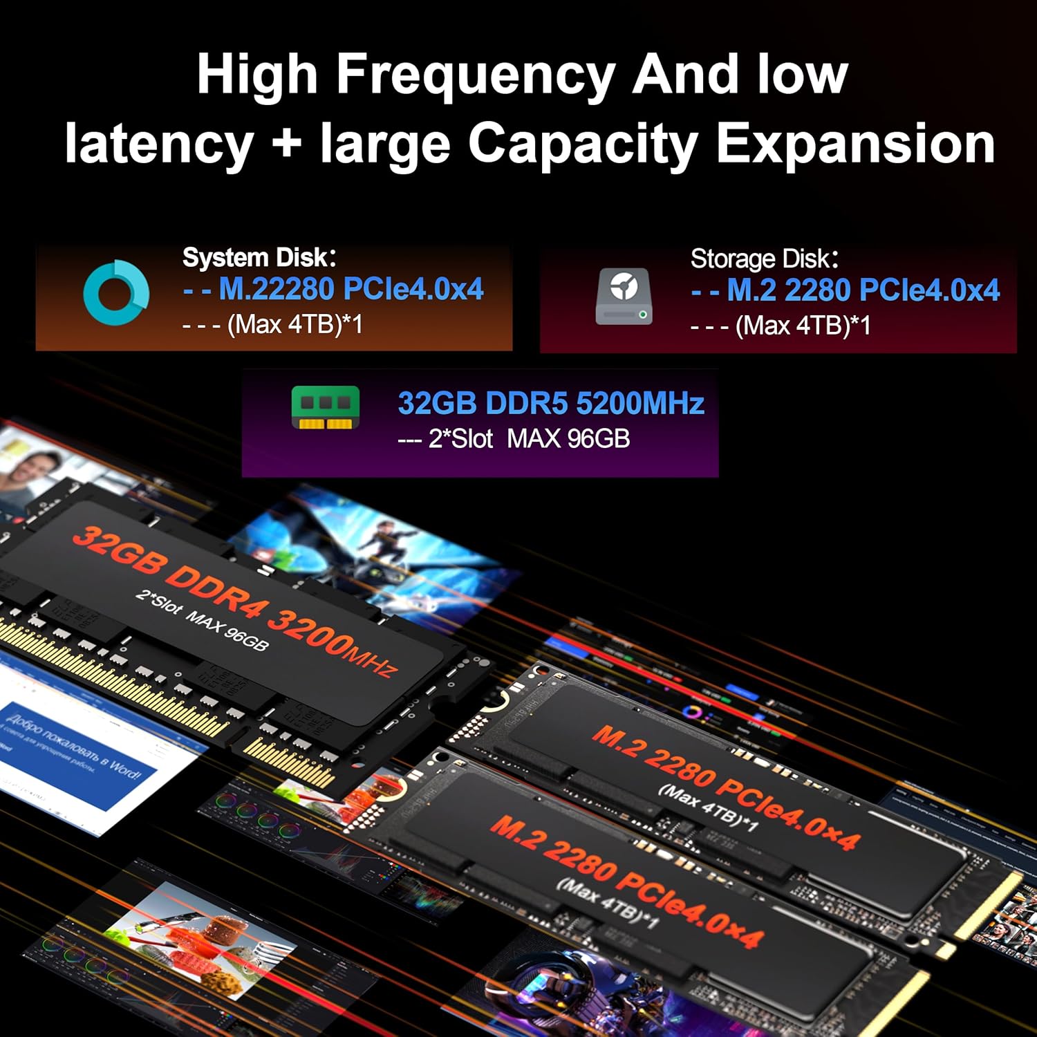 The mini PC comes with 32GB (16×2) of DDR4 3200MHz memory, which ensures high data transfer rates, allowing the CPU to quickly retrieve data from memory for processing. The device also features a 500GB SSD, which is an M.2 interface/2280 form factor/PCe4.0×4 (8GB/s speed) card-type hard drive. This SSD provides fast storage and loading times, making it ideal for both entertainment and office work. The mini PC also supports up to 96GB of memory and up to 8TB of storage, making it highly expandable.