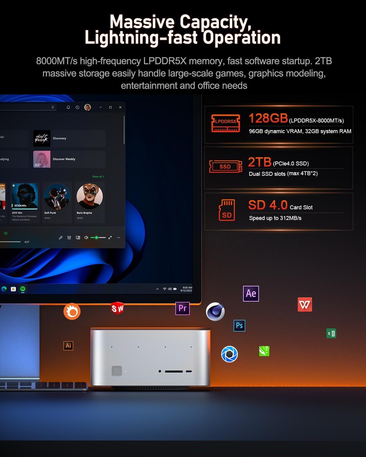 The Beelink Mini PC, GTR9 Pro, comes with an impressive 128GB of LPDDR5X-8000 RAM, which provides ample memory for demanding applications. The device also features a 2TB Crucial SSD, which offers blazing-fast storage speeds of up to 7000MB/s. The SSD is installed in a dual M.2 2280 PCIe 4.0 slot, which supports up to 8TB of storage. This means that users can easily upgrade their storage capacity as needed, making the Beelink Mini PC, GTR9 Pro, a future-proof device.
